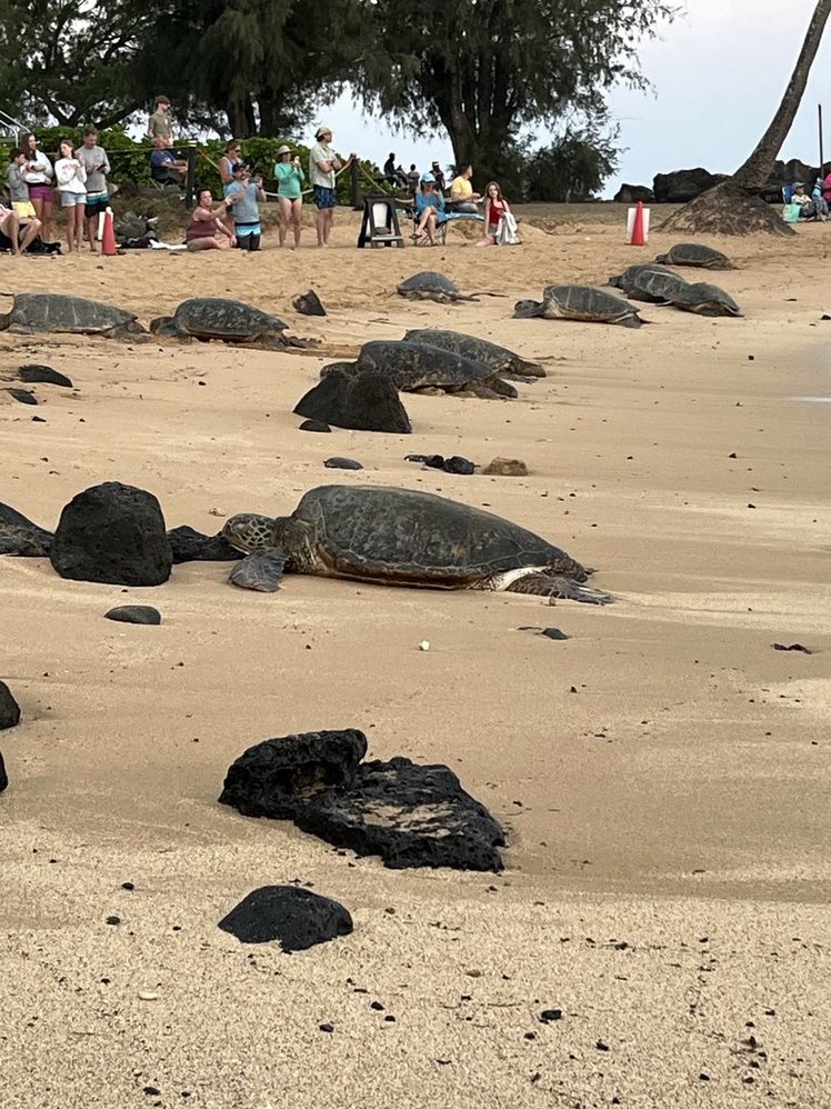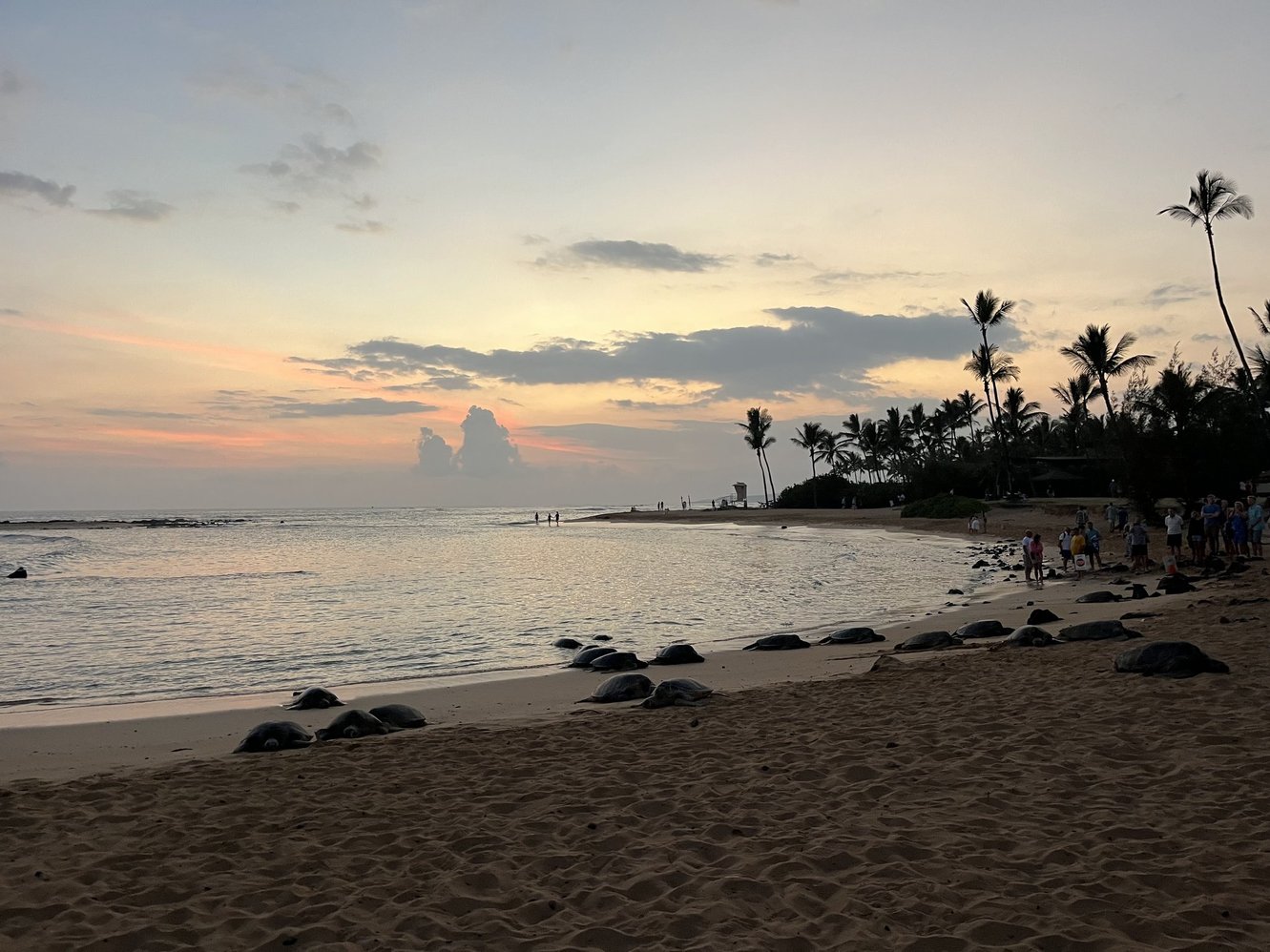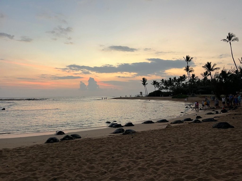 After settling into our villa and making a quick dinner, we took a sunset stroll to Poʻipū Beach—just a few minutes’ walk away. We were greeted by a sight we won’t forget: dozens of sea turtles snoozing on the shore. We counted 13 when we arrived… and 22 when we left!